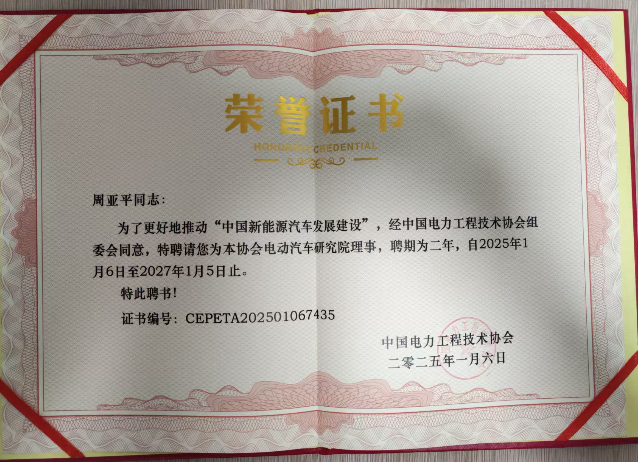 为了更好地推动“中国新能源汽车发展建设”,经中国电力工程技术协会组委会同意,特聘请您为本协会电动汽车研究院理事,聘期为二年,自2025年1月6日至2027年1月5日止。